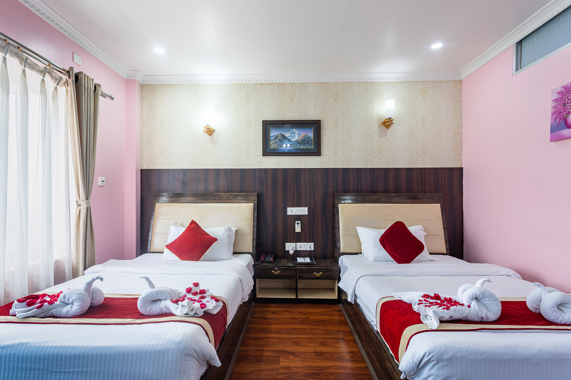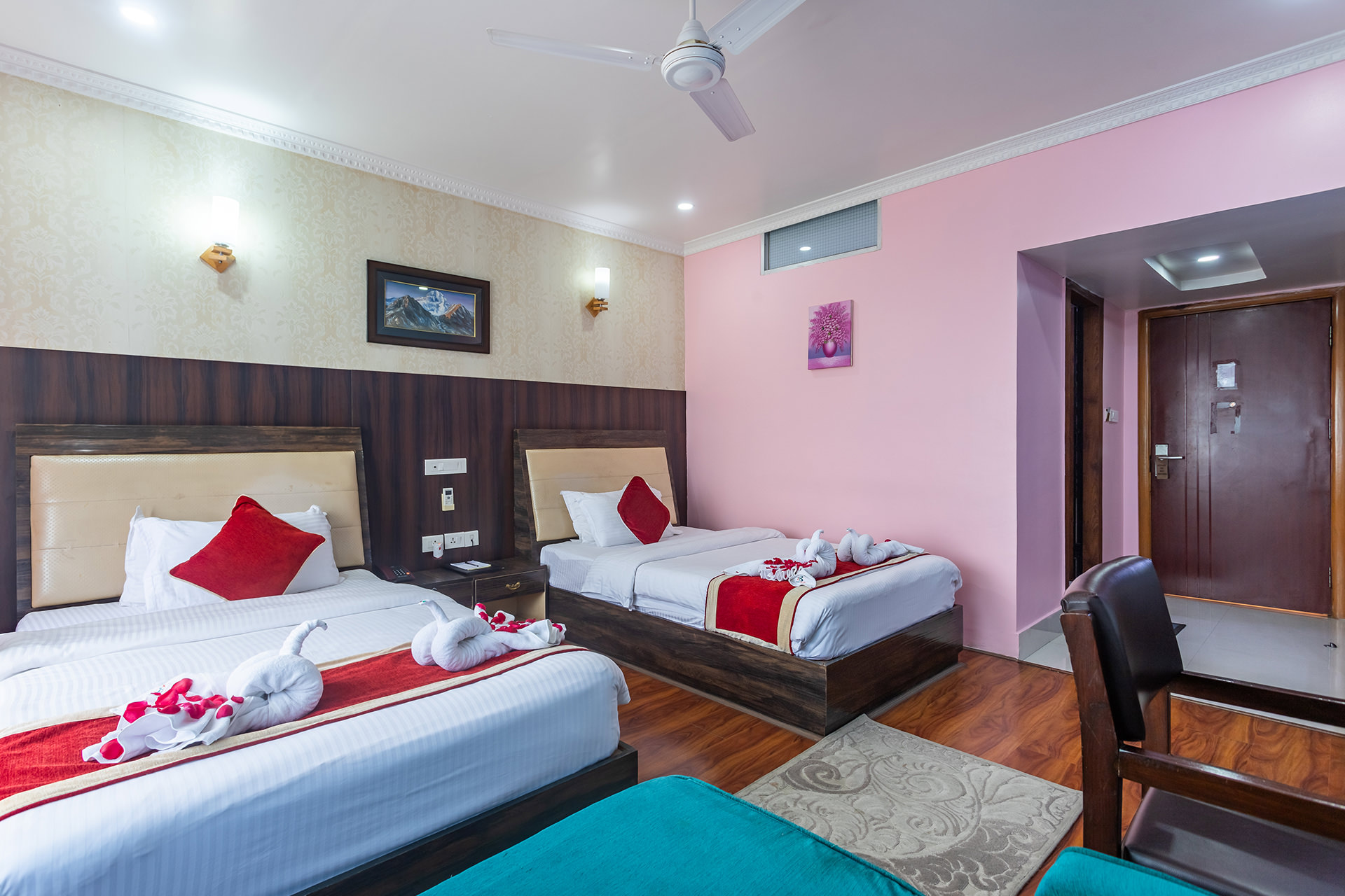 Our Deluxe Twin/Double Room offers a choice of two queen-sized beds or a king-sized bed. The room is equipped with air conditioning, a flat-screen TV, and a mini-fridge. Guests can unwind in the private bathroom with complimentary toiletries, and enjoy free WiFi, daily housekeeping, and 24/7 room service.